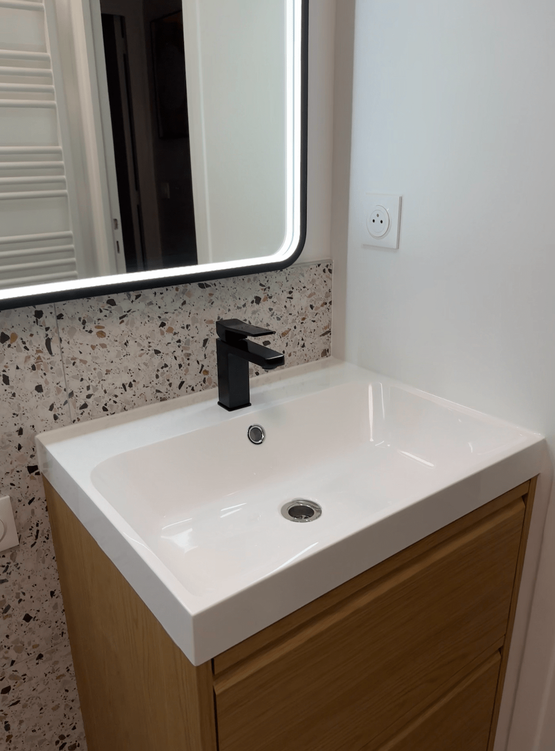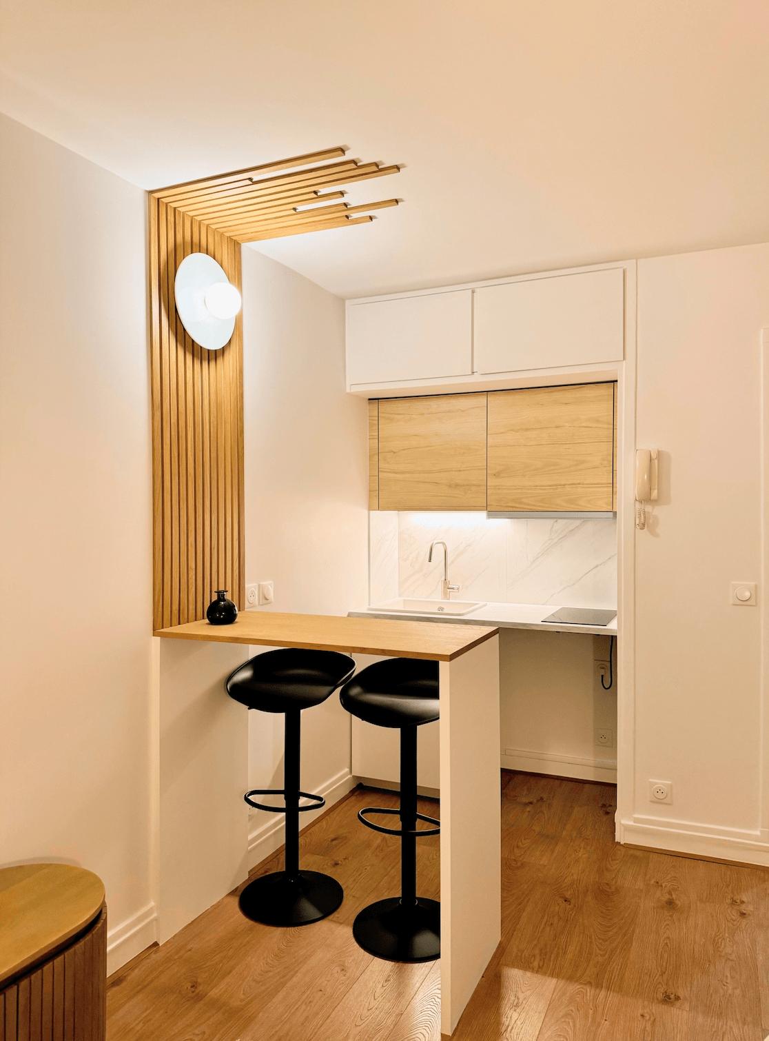 Une fois le bien déniché, nous avons repensé les espaces pour révéler tout son potentiel. La cuisine et la salle de bains, datées et peu fonctionnelles, ont été entièrement rénovées. Dans la pièce de vie comme dans la cuisine, de nouveaux rangements sur mesure sont venus optimiser l’espace, tout en alliant confort et praticité.